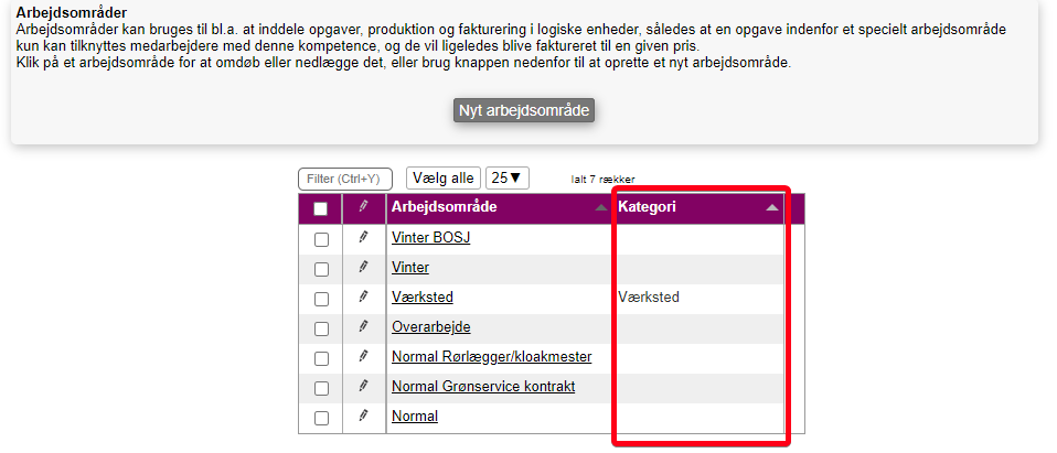 3) Hvis der er erklæret en kategori andet end et tomt felt, så er det de erklærede + den "tomme" kategori. Dvs. hvis der er kun én kategori "Værksted (som nedenstående billede), så er der faktisk to; (1) Det tomme felt og (2) Værksted, da det tomme felt bliver anset som en kategori i sig selv.