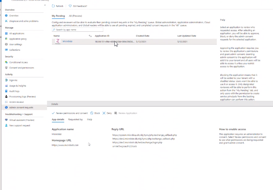 In the pending approval screen shown above, select Microbizz and then select "Review permission and consent" in the lower part of the screen. This will allow any user from this tenant access to the Microbizz synchronization using modern login. The users who originally made the request will have to go through the setup procedure again, but this time they will be lead straight through.