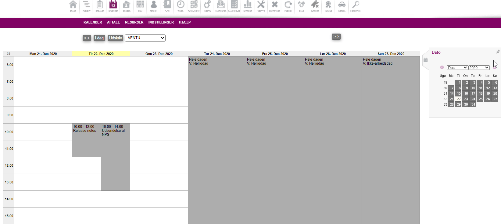 The date/month selector on the various overviews in the Calendar module has now been moved to a "sidebar" in the right side of the screen; for those overview that include a team selector, the team selector has been moved to the same spot. The Print button has been moved slightly.