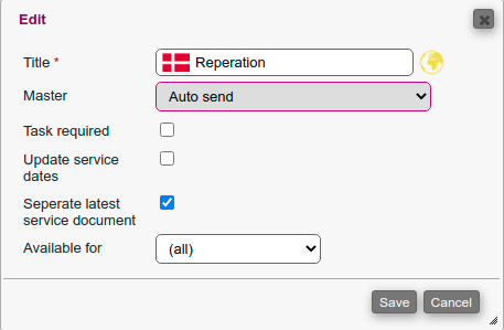 The equipment service protocols have been extended with two new options: "update service dates" (default on) and "seperate latest service documents" (default off).