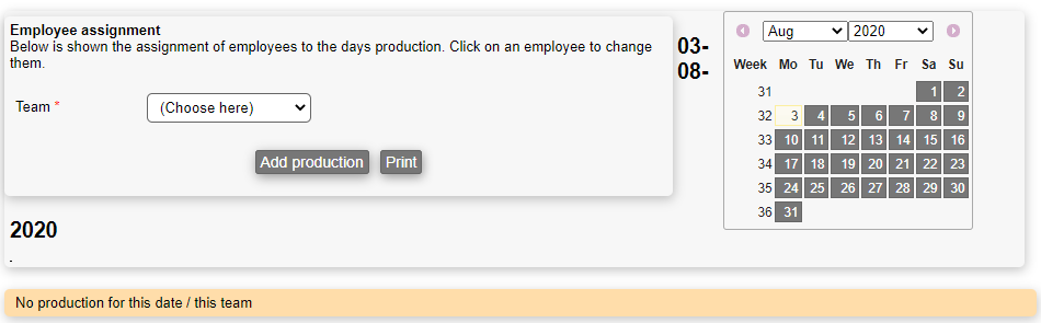 If no production plan has been added yet, you can do so by choosing a team and date and finally pressing the "Add production"-button. This presents you with the following box: