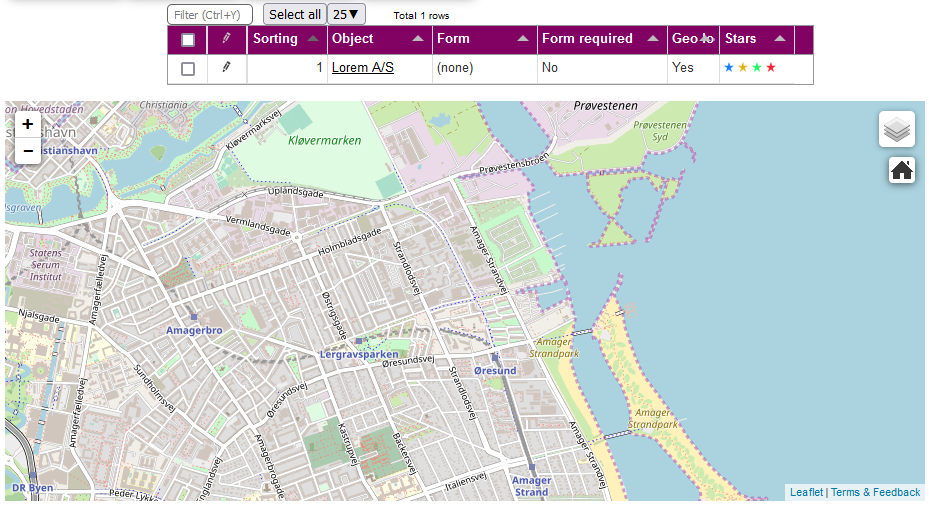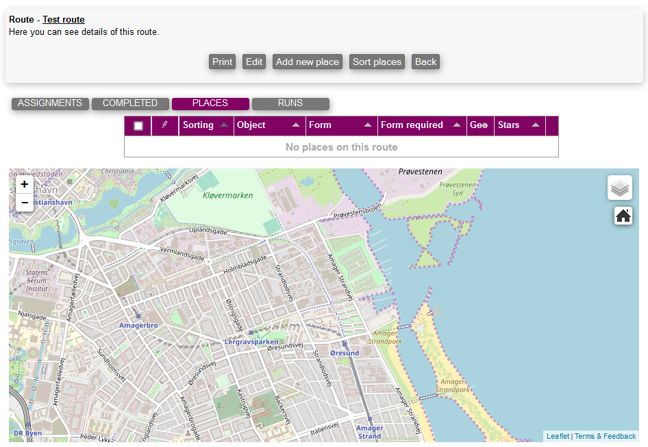 Places: Here you can see the map together with a list of all places (i.e. objects added with the Add new place button)