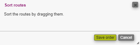 Pressing the Sort routes button after you have added all the routes needed, allows you to manually order the routes by dragging them around, thus determining their order. When you are satisfied, simply click on the Save order button.