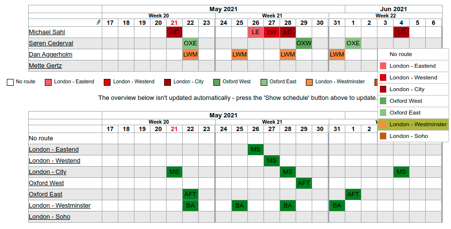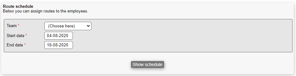 If you have many routes and many employees then is can be slow to assigning routes to the employees by selecting the route and then creating an assignment for each employee. Instead you can use the ROUTE SCHEDULE menu to quickly assign routes to the employess. It also gives you an easy overview of how the routes are assigned.
