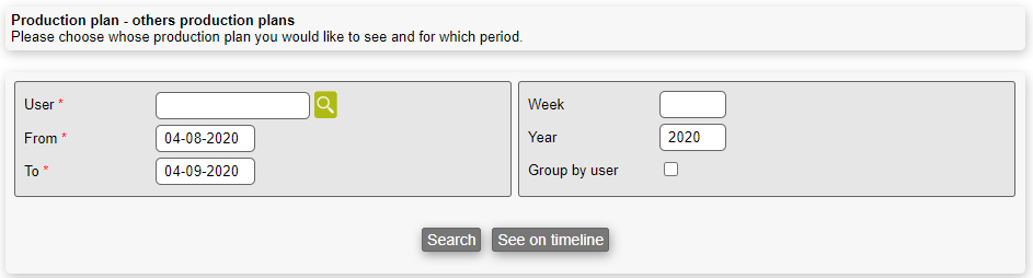 When you click on the "Search"-button, the planned production will be sought and showed, where you afterwards can switch between a timeline and a list by pressing on the "See on timeline"- or "View as list"-button, respectively.