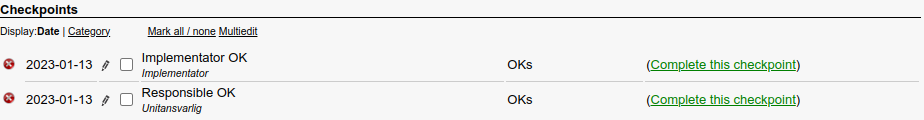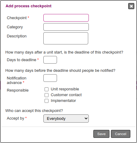Responsible: Which role should receive a notification mail; if there is no responsible for the checkpoint the mail will be sent to the unit responsible.