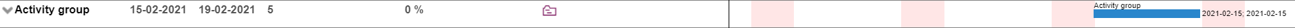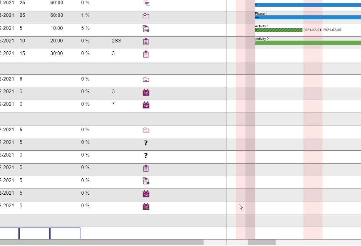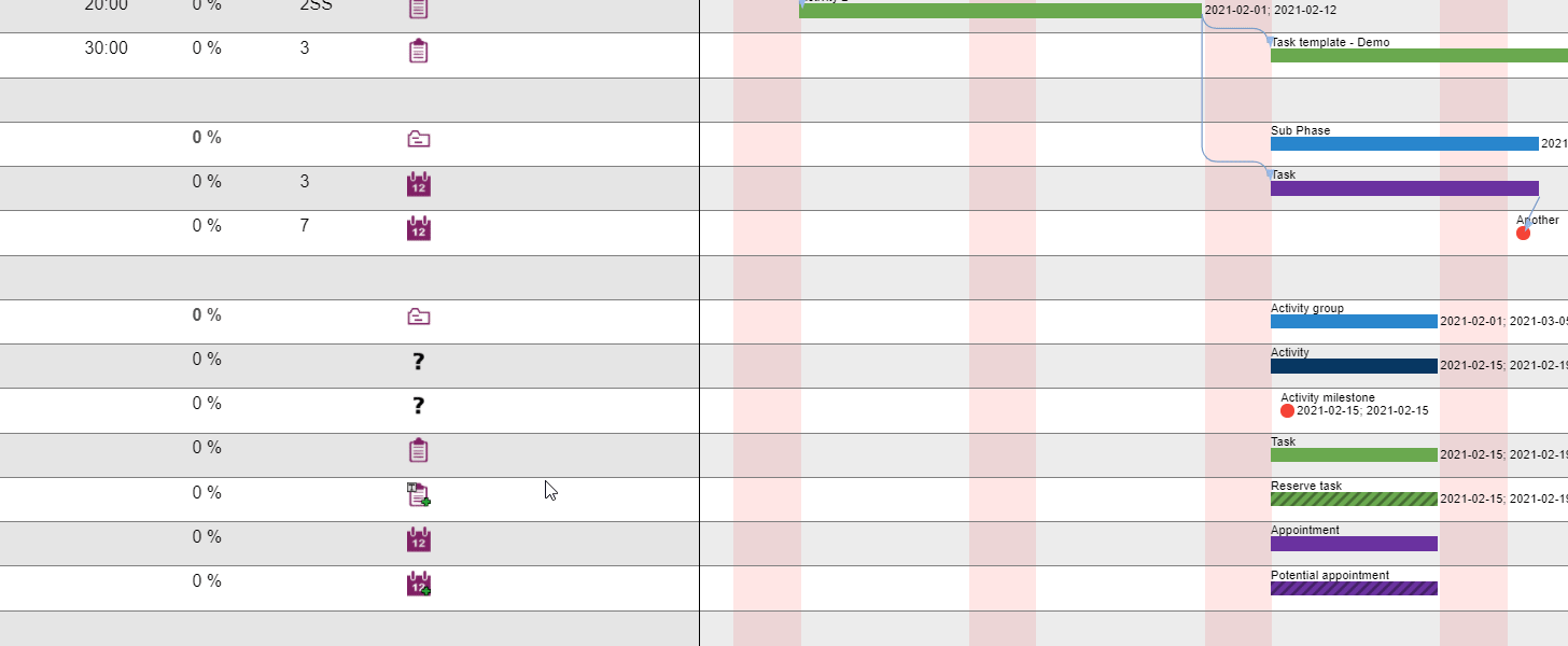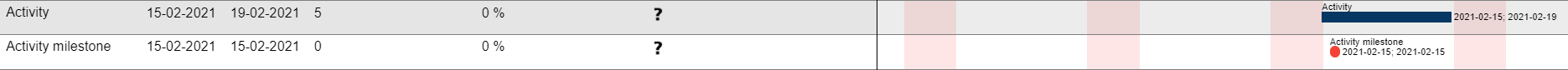 The different activity types are distinguishable by their icon on the type column, and the color/shape of the gantt line.