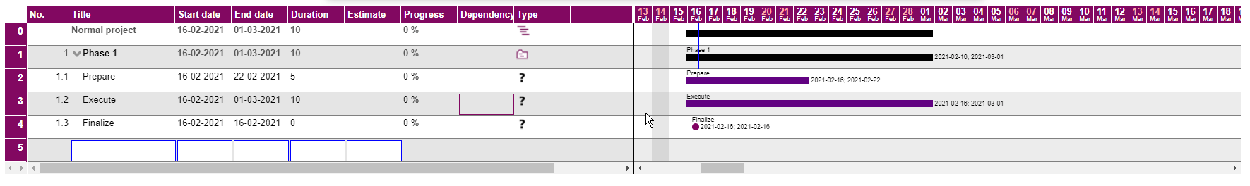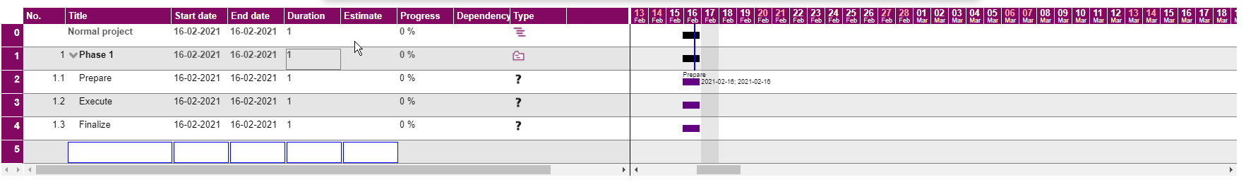 As seen below, a number corresponding to days is typed, and the right side of the gantt immediately shows the timeline being changed.
