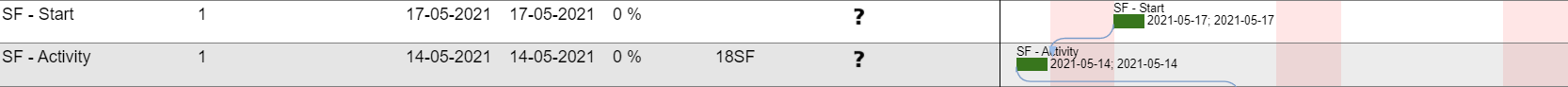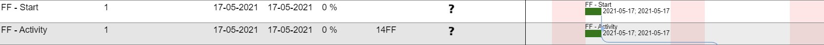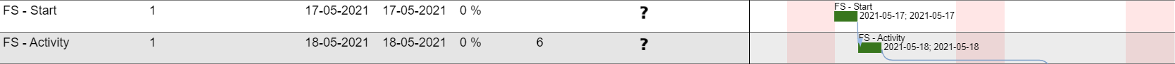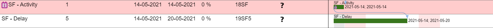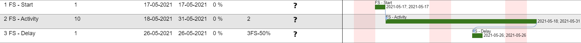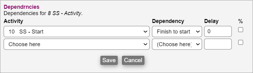 - %: An alternative to the regular delay, stating that the activity can start/finish when a certain % of the dependent activity is passed