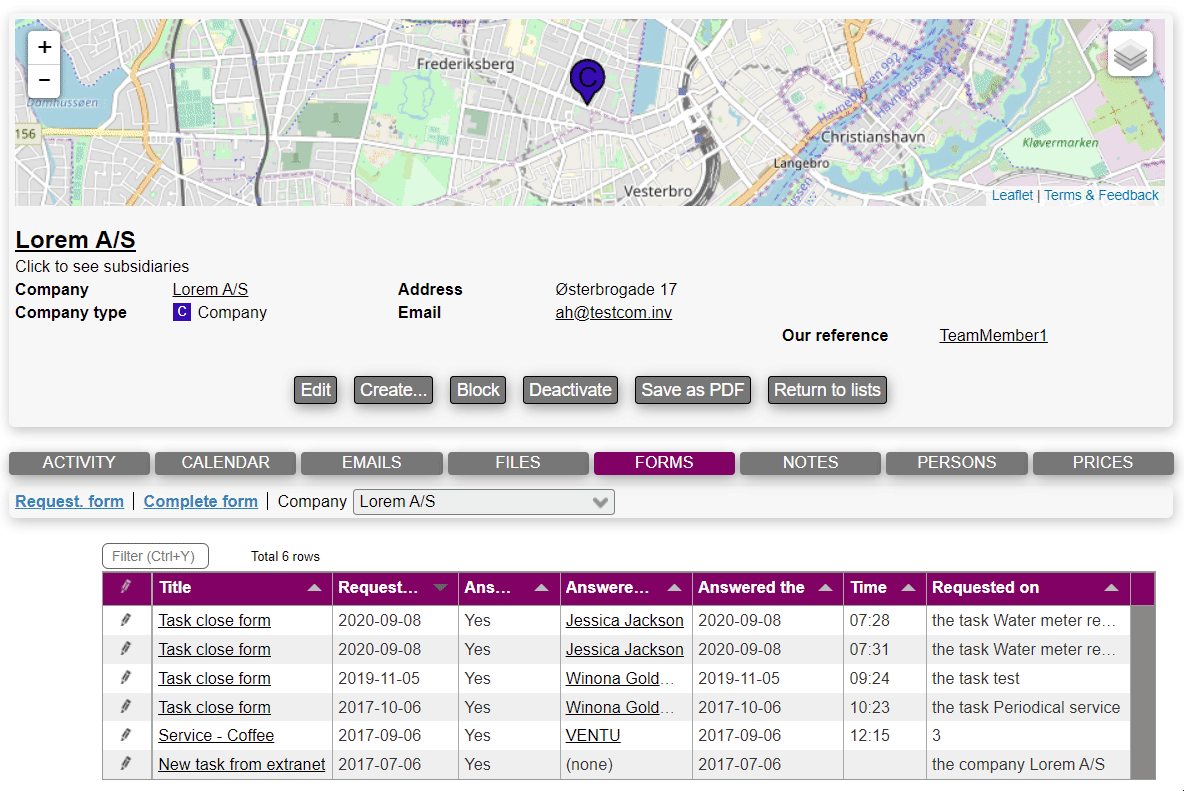 Notice that forms filled out on a task (or equipment etc.) will be listed amongst the form answers for the task's company; however this doesn't apply to forms that were requested on the task (or equipment).