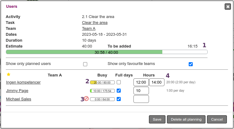 (4) Hours: If the Full days checkbox is checked then you can specify the total number of hours the user should be allocated to this task - this will be split over the work days. If the Full days is not marked then you can specify the part of the day where the user should be planned - this applies to all work days.
