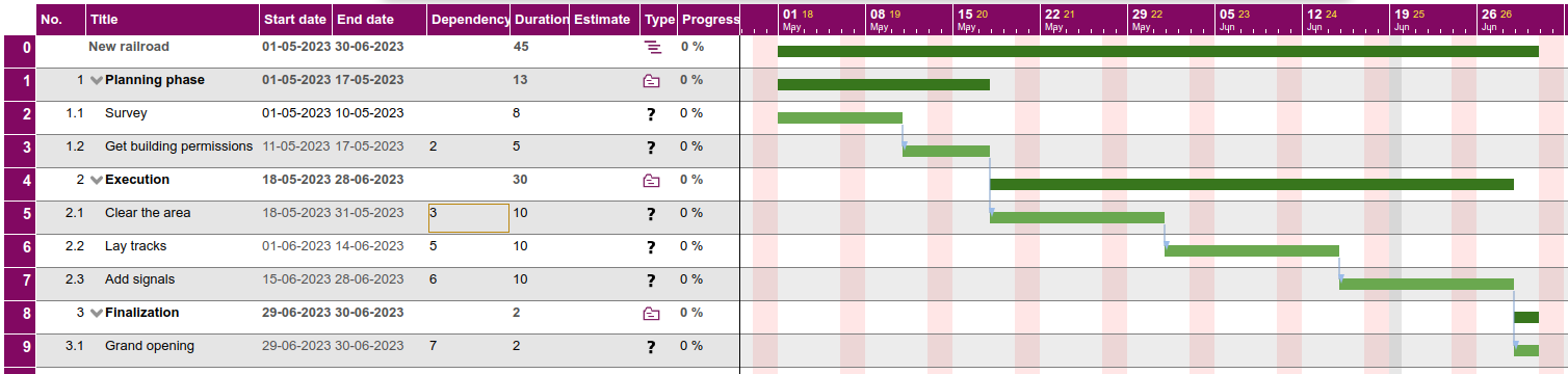Activities may depend on other activities, eg. the activity “Get building permission” should not be started before the activity “Survey” has complete. Activities may be grouped, in the example below the “Planning phase” activity is a group with two sub-activities: “Survey” and “Get building permission”.
