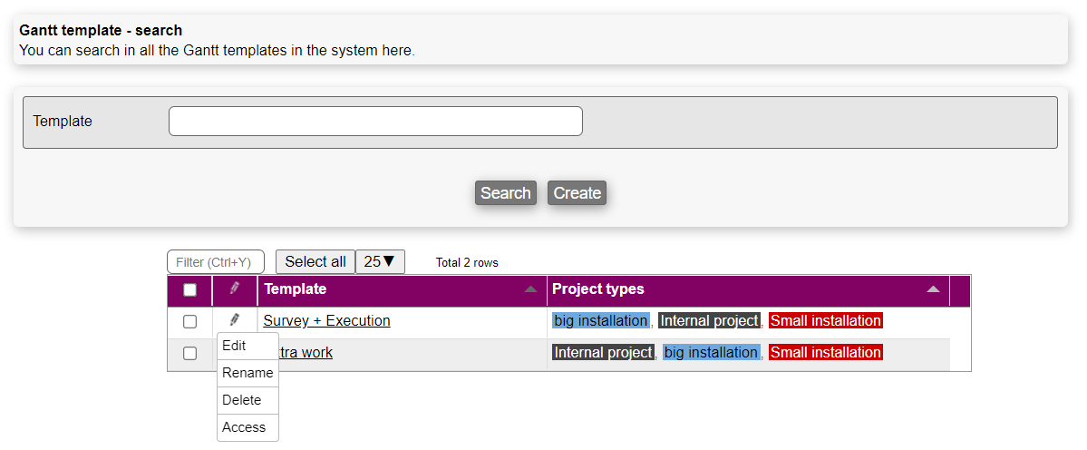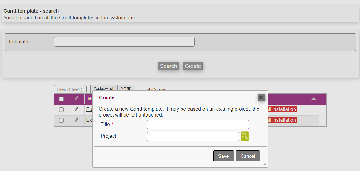 Creating a template is done by accessing the menu GANTT TEMPLATES/SEARCH.