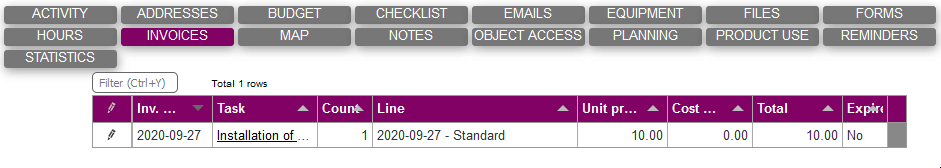The invoices tab is used in most modules. The tab revolves around the invoice lines used on a specific object. The main purposes are: