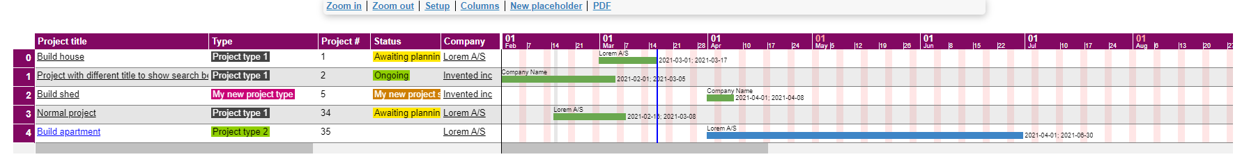 As seen in the example below, there are 4 projects. They are shown with as a table view on the left side and gantt result on the right side.