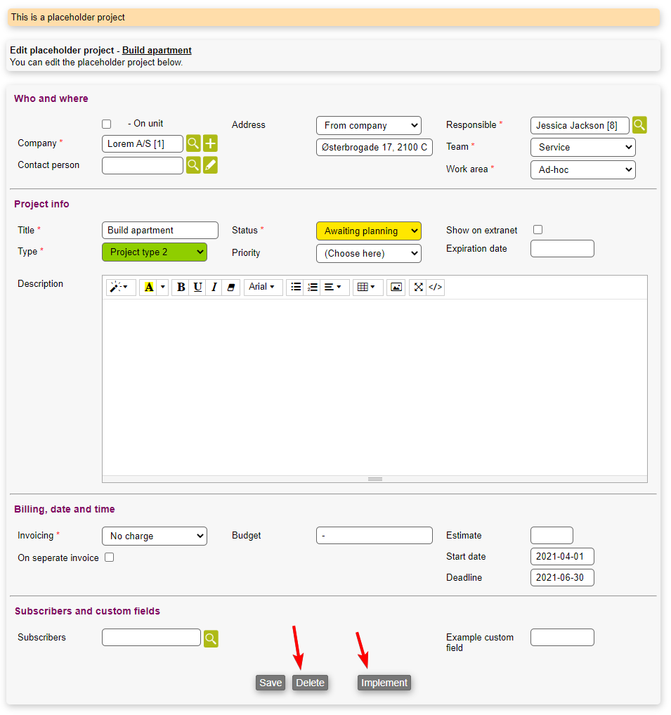 There are few required fields, to make sure that a placeholder can be created quickly. For the same reason custom fields aren't required either.