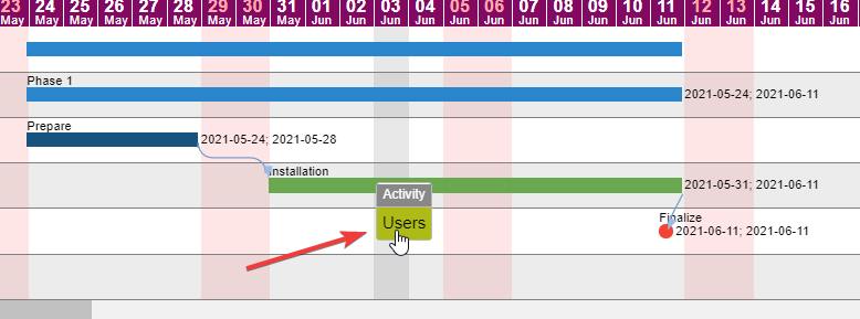 If the activities are moved either manually or as a result of their dependencies, the planning will be changed as well.