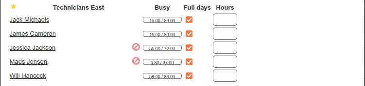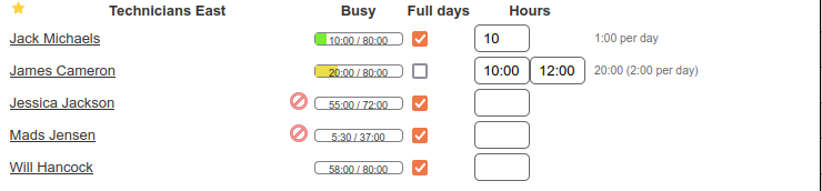 For each user is shown the name, a possible warning about not being at work on all days, a small busy bar showing how much time is planned for the user, and the total work time of the user, plus fields for adding new planning.
