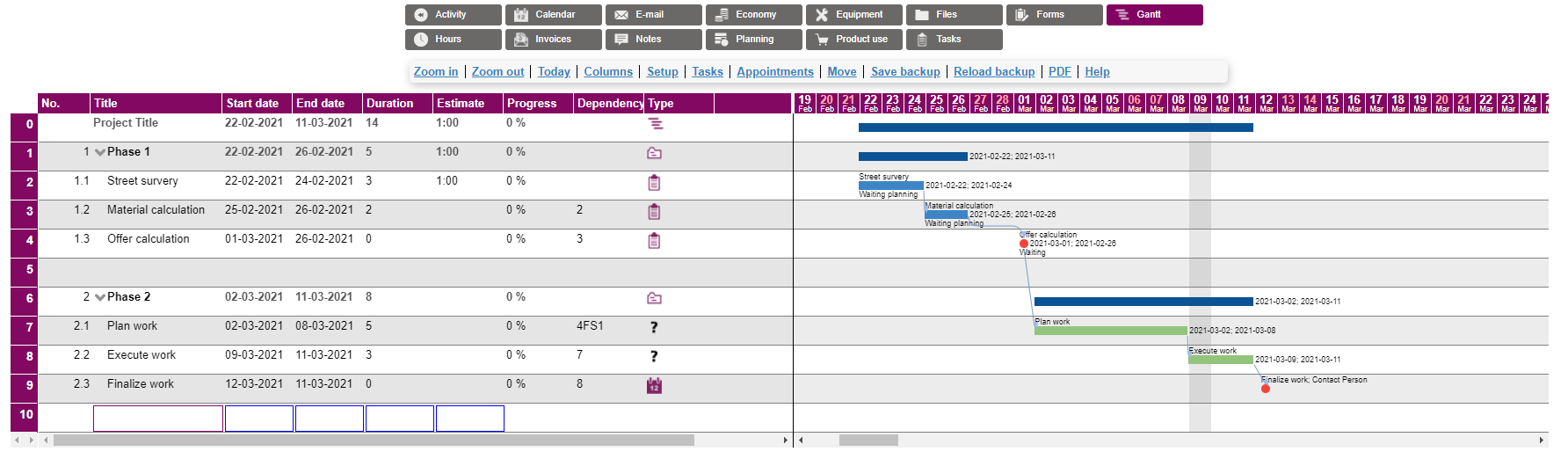 This is the project planning tool where you can build you project and group it into phases, tasks, appointment and future activities.