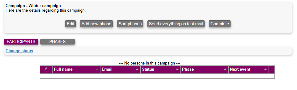 A campaign can have multiple phases, eg. an initial mail and a followup mail. A phase may either simply send a mail, or it may request that the person fills in a form. When the form is filled in, the person advances to the next phase in the campaign.