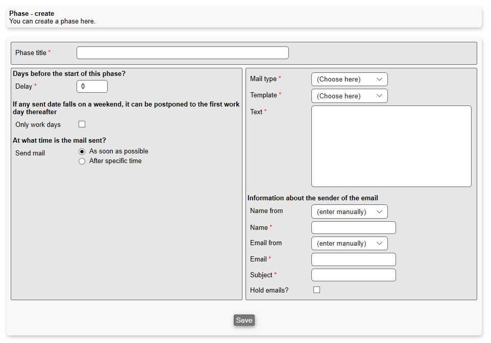 Delay: Specifies how many days there should be between the previous phase and this one, before this phase begins and the mail is sent.