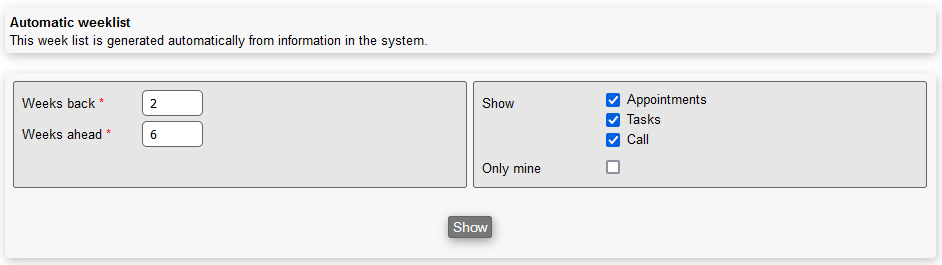 You can generate week lists, displaying various information from your system.
