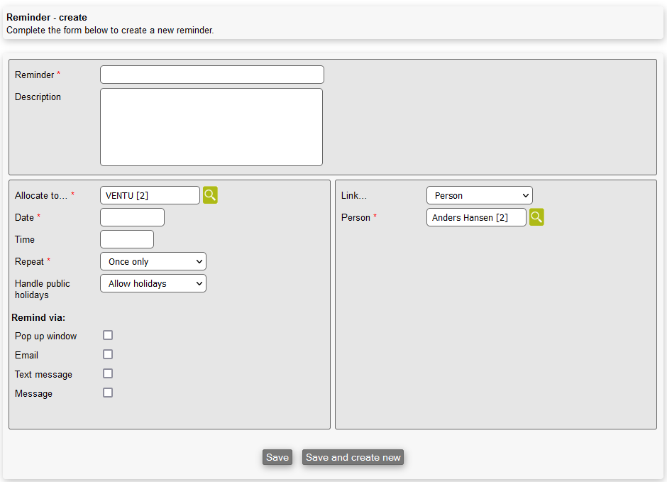 In this section, by clicking on "Create new" in REMINDER > CREATE, you are able to create a new reminder: