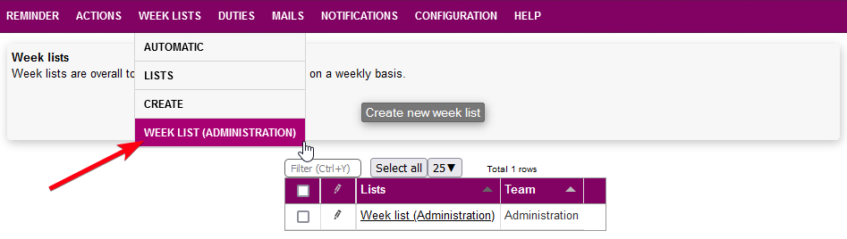 In this section, by clicking on "Create new" in WEEK LISTS > CREATE, you are able to create a new week list: