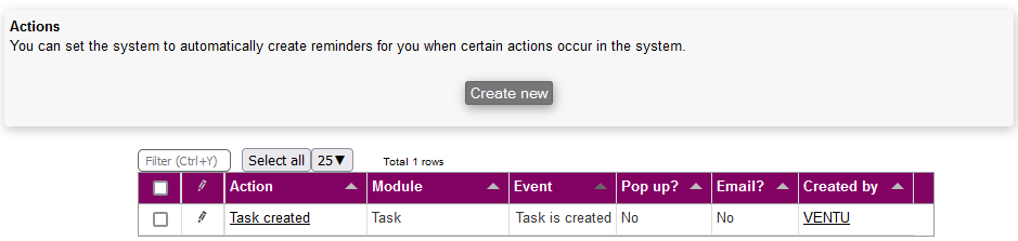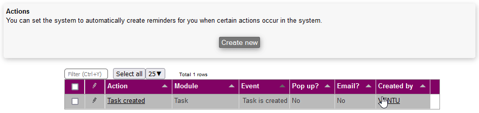 When pressing the Create new button, you will be redirected to CREATE in the ACTIONS menu: