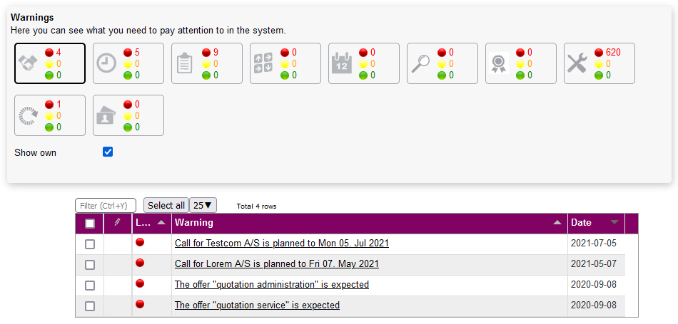 When clicking on a warning, you will be redirected to the object you have to pay attention to, e.g. a user that needs to close a certain worksheet, or an equipment that needs to be serviced.