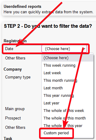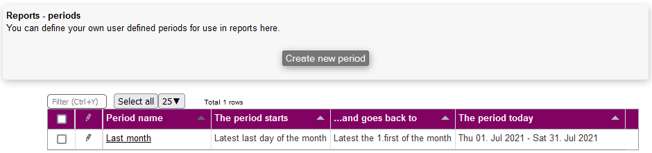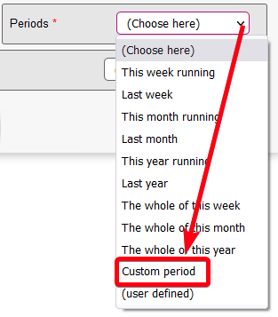 When you are creating or editing some user-defined reports e.g. hours registrations, you can choose any custom period you may have created. This is done when choosing the date you want to filter your data with: