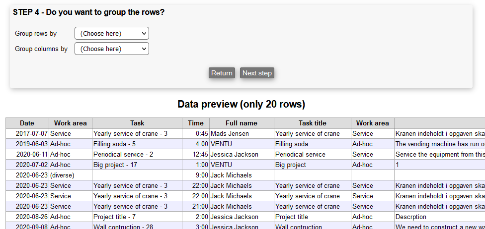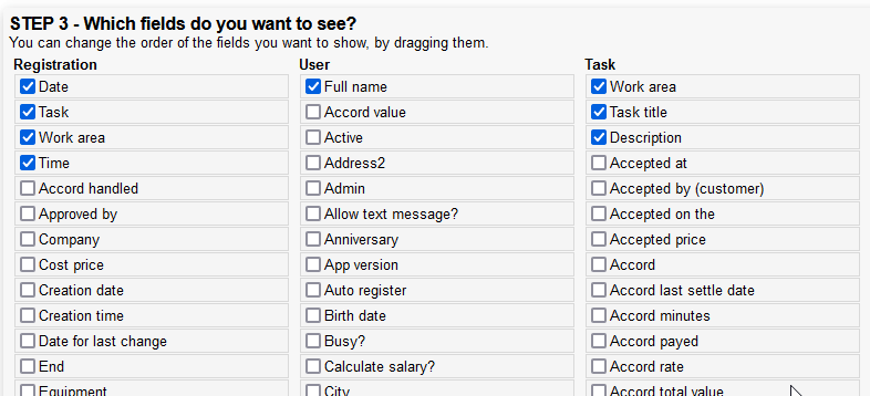 In this step, you can choose to see any field from the chosen data by marking the ones you want. Furthermore, you can change the order of the fields shown, by dragging them: