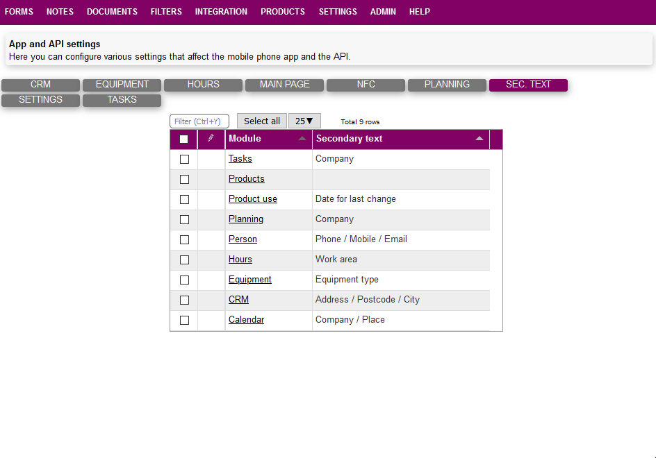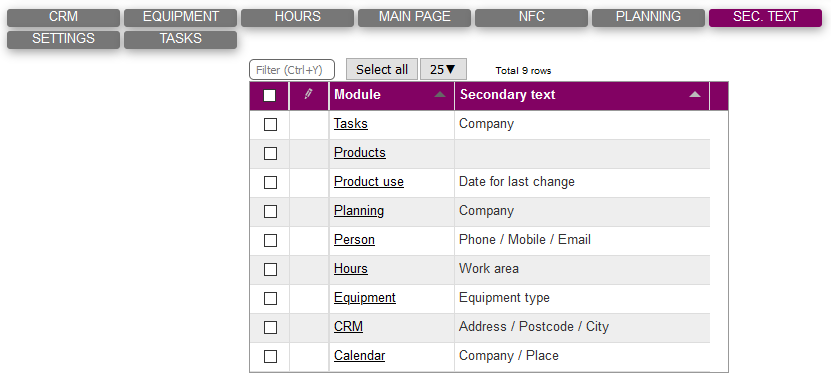 This section is also a bit different, as you can configure which text to show beneath each object for the various modules' objects in the app. This is done by clicking on a module title: