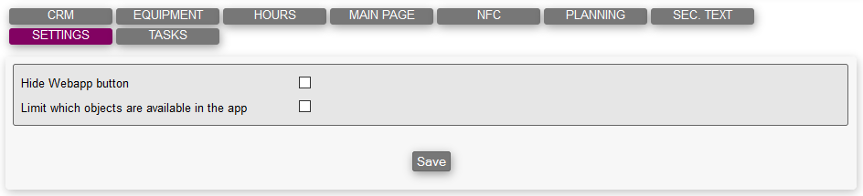 Hide Webapp button: This is only relevant for users of the old app. It hides the button that gives web access to Microbizz through the app.