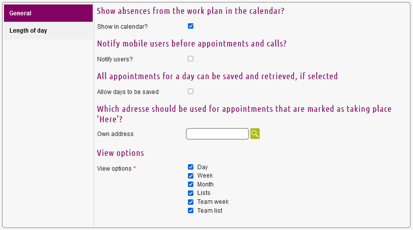 Show absences from the work plan in the calendar: A setting to choose if you want to see absences in the calendar view.