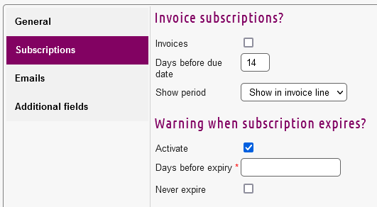 Days before expiry: The number typed in here will result in the number of days before a subscription expires
