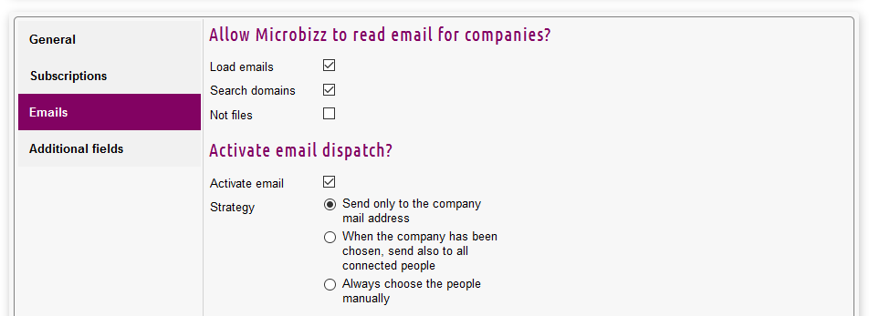 Load emails: If checked, copies of emails are archived to the company's email tab. Requires email integration