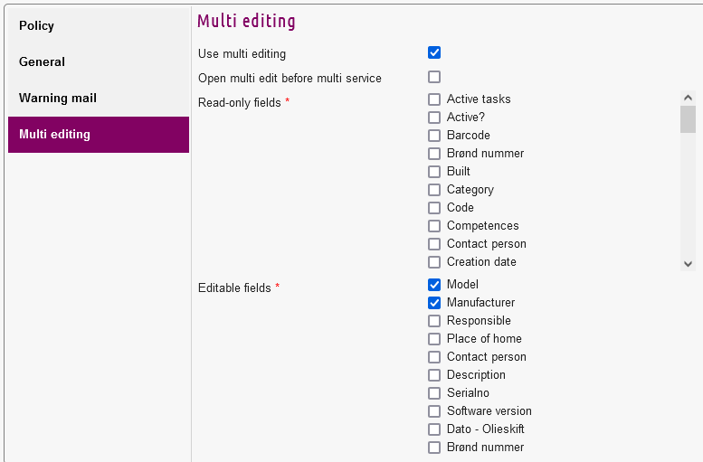 Open multi edit before multi service:Use this function if you would like to complete a multi service, but where you firstly multiedit some fields on the selected equipment. This is especially useful if you need to do service, but where the content of a service PDF certificate needs to include the newly edited fields