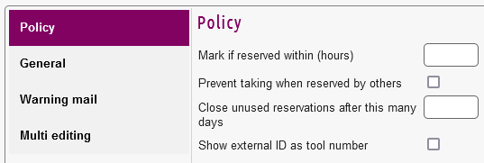 Mark if reserved within (hours): Specifies when a tool should be considered as "reserved soon". It should be noted that equipment are shown throughout the system with different color codes: green = available, red = reserved, and yellow = "reserved soon")