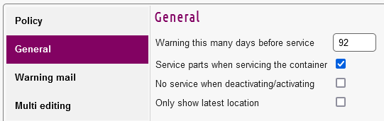 Service parts when servicing the container:If a piece of equipment contains parts, this setting specifies if the parts should also be serviced