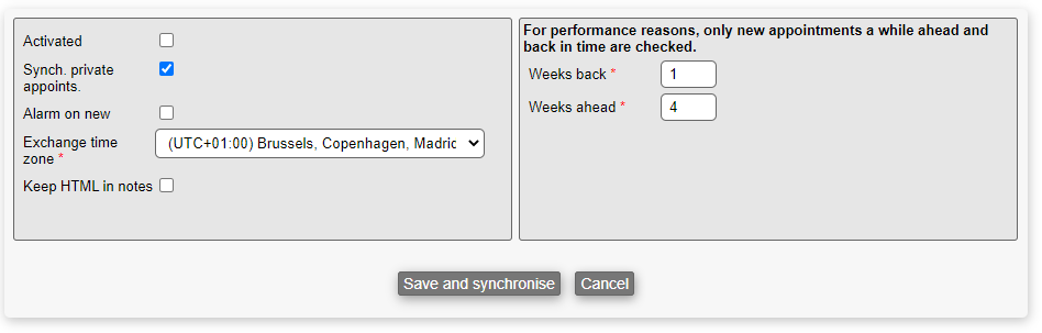 - Weeks back / ahead: Microbizz will only check for new appointments in Exchange a certain number of weeks back and ahead. Appointments out of this range will not be synchronized.