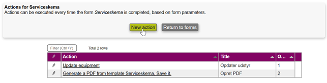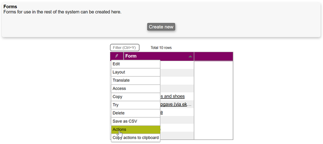 Actions are different events that can happen automatically in Microbizz when a form is filled out. To create new actions and see actions already created: In the SETUP MODULE choose FORMS > LISTS, click on the pencil connected to the respective form and select "Actions" from the dropdown menu.