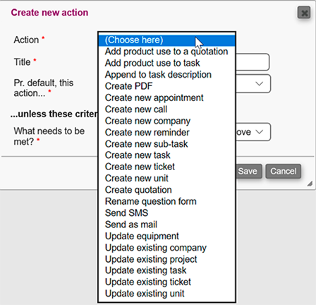 There are lot of actions to choose from, but be aware that most actions only work in specific contents. If an action is requested in the wrong context, it will simply be ignored. So if an action is to update a task, but the question form is filled on a CRM object, then the action will not execute.