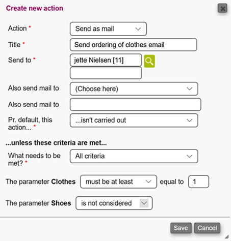 If a user fills out a form ordering clothes, we may want the system to send a mail and the type "Send mail" is selected with following fields to fill out: