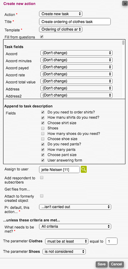 Fill from questions: Answers to specific questions can be used to fill in certain fields on the task. For each field, one can select a question from the form, where the given answer is used to fill the form. It is also possible to select one or more fields which will be appended to the task description.