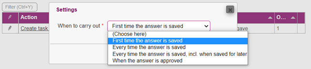 Every time the answer is saved, incl when saved for later - the action is executed whenever the answer is saved, incl. when it is saved for later