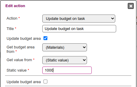 There is a "Update budget area" section foreach possible budget area. Each section can be enabled/disabled. The budget area to update can be be pres-selected or it can be selected in a form question; the same goes for the budget value.