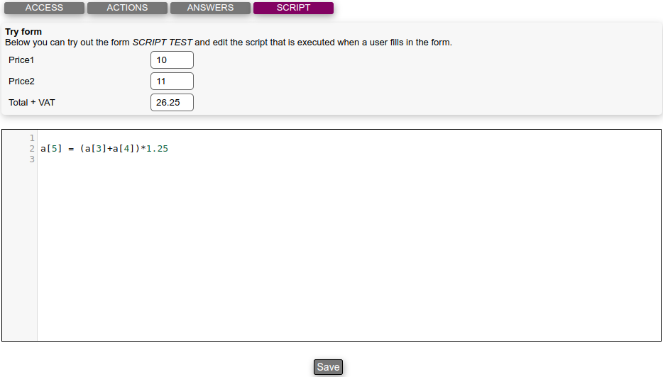 The script is edited in the SCRIPT tab, where you can also try out the form: