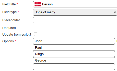 Notice that when you set the value for a radio / several of many / one-of-many field, you should not specify the text that is displayed to the user, but instead specify the underlying value used by Microbizz. F.ex. for the field below you might specify