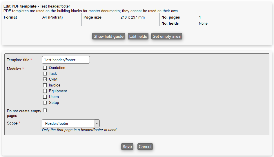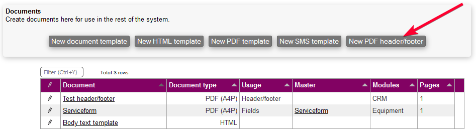 Finally, you can create templates for header and/or footer for use in your PDF templates. To do so, click on the "New PDF header/footer"-button as shown below.